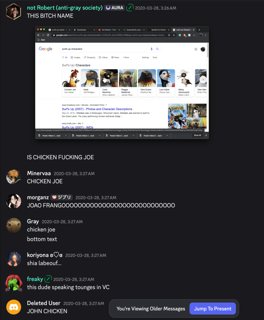 Admittedly he’s right about change, and it took me a little bit to come around the first time I heard brakence, but the video for brakence’s fuckboy was so visually intriguing both in it’s VFX work and it’s phenomenal face reveal it kept me coming back until I came around on it. Despite my personal anecdote though Briss is right, and the majority of people in the community were absolutely eating up this sonic revolution they were helping contribute to. It was a community like no other, not just in it’s strength, but it’s chaotic unity. My strongest memory of the Overcast discord was a hectic argument that consumed the entirety of their general chat where the english speaking users and the Brazilian users argued about the name of the chicken from the 2007 film Surfs Up (this is not a joke, this actually happened).